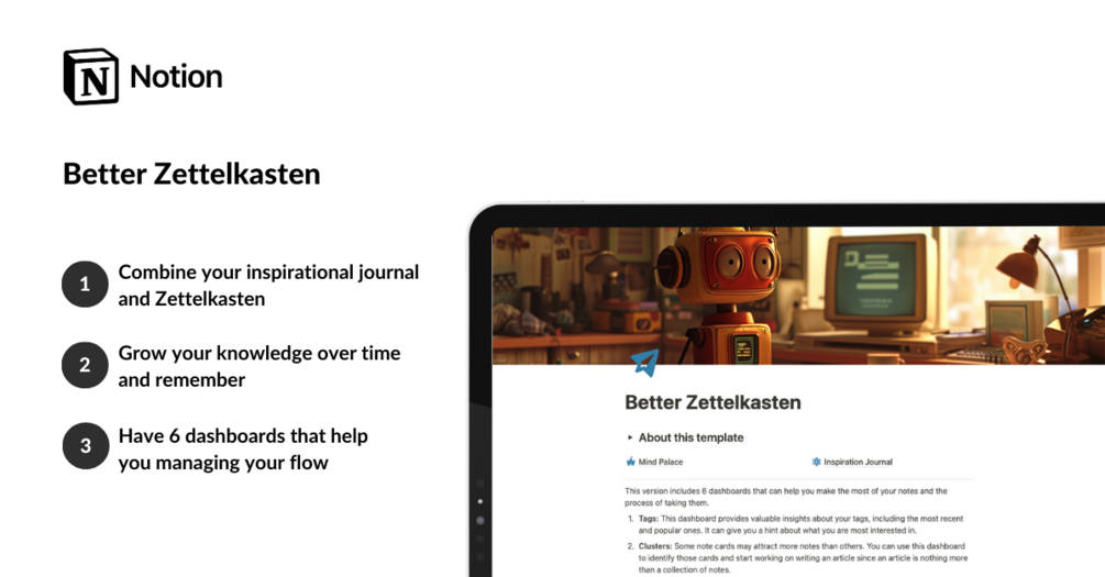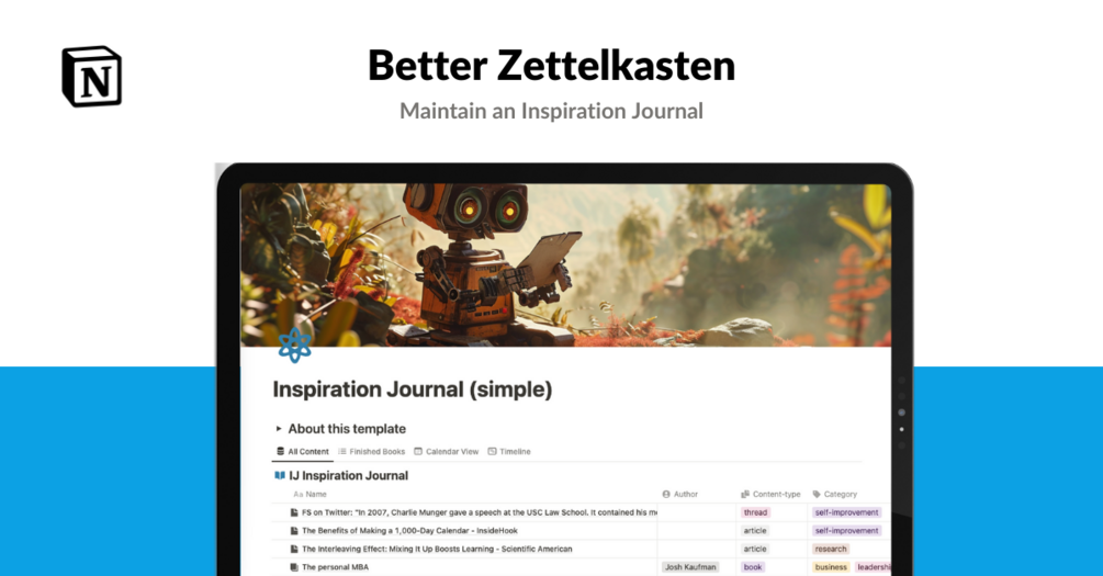 This template combines an inspiration journal (or resonance calendar, commonplace book) and a zettelkasten note-taking approach. This version includes 6 dashboards that can help you make the most of your notes and the process of taking them.