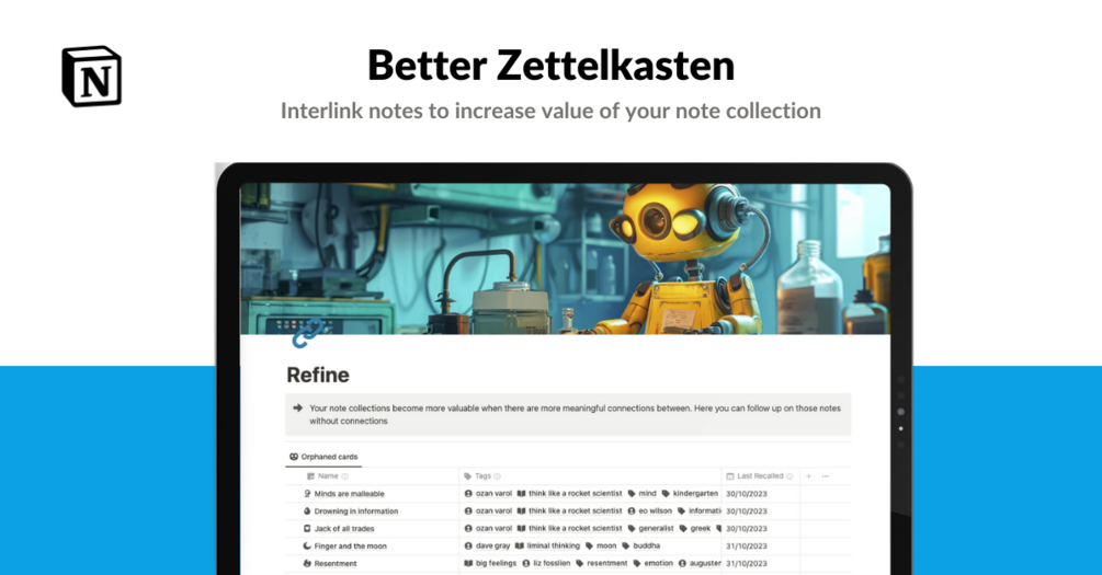 - Refine: Sometimes, a note may not have a linking card when you record it. This dashboard encourages you to revisit your notes over time and link as many notes as possible with each.