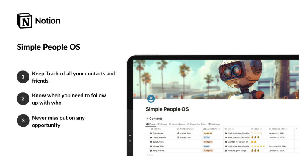 Keeping track of everyone in your professional life has never been easier. With this simple and intuitive template, you'll always know when to follow up with your contacts.